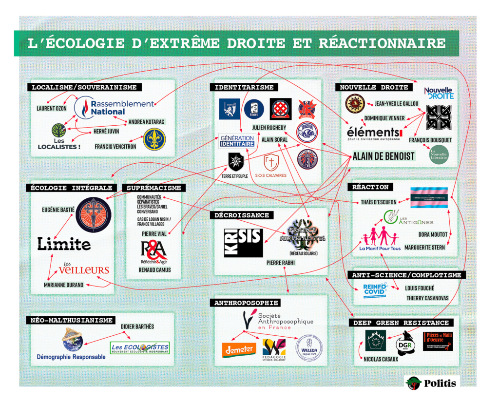 Même si les représentations visuelles sont d’excellentes aides à la compréhension, cartographier les extrêmes droites reste une tâche ardue tant elles sont protéiformes, interconnectées et en perpétuelle évolution. Cette carte se concentre sur une partie des mouvements, organisations et partis politiques qui abordent l’écologie avec une perspective d’extrême droite ou réactionnaire. Certains sont électoralistes, pas tous. Malthusianistes, séparatistes, fascistes, royalistes, décroissants, ésotériques… La liste est longue, et elle n’est évidemment pas exhaustive, que ce soit au niveau des personnalités, des groupes ou des liens représentés.